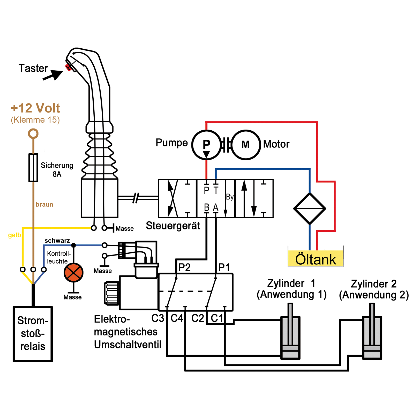 Folgend ein Anschlussbeispiel zur Verwendung des Stromstoßrelais in Kombination mit einem Kreuzhebel mit Taster und einem 6-Wege Umschaltventil. Mit dem Halterrelais können Sie ein Umschaltventil dauerhaft über ein Kreuzhebelsteuergerät mit integrierten Tastern schalten. Dabei müssen Sie den Taster nicht gedrückt halten. Durch erneutes drücken des Tasters, schaltet das Stromstoßrelais das Umschaltventil wieder aus.