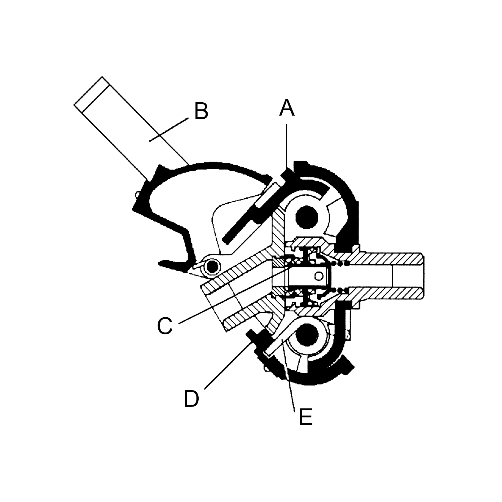 Beim Ankuppeln des Anhängers wird der Handgriff (B) nach unten gedrückt, wobei die Schutzdeckel (A und D) sich öffnen. Der Duo-Matic-Anhängerteil wird unter die Schutzdeckel gelegt und der Handgriff (B) wird wieder losgelassen. Die Drehfeder (E) wirkt auf die Schutzdeckel (A und D) und drückt den Anhängerteil gegen die automatischen Schließventile (C), wobei diese sich öffnen und die anstehende Druckluft gelangt zum Anhänger.